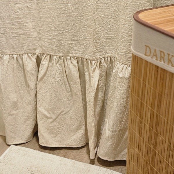 Cortina de baño con volado y ojal bordado, confeccionada en tusor 100% algodón.