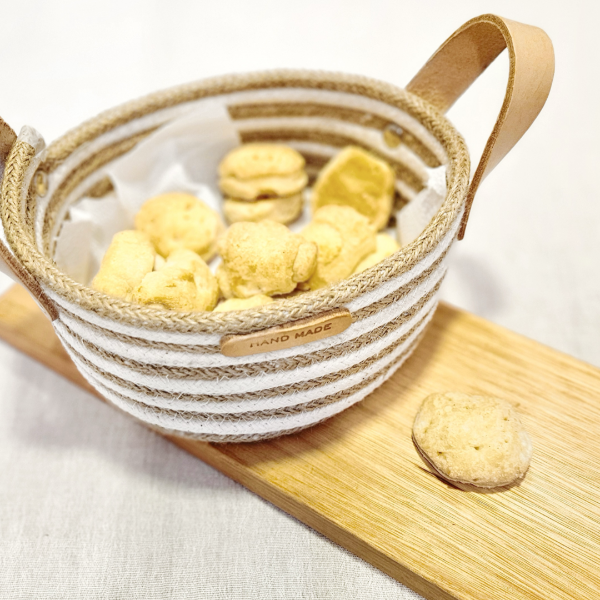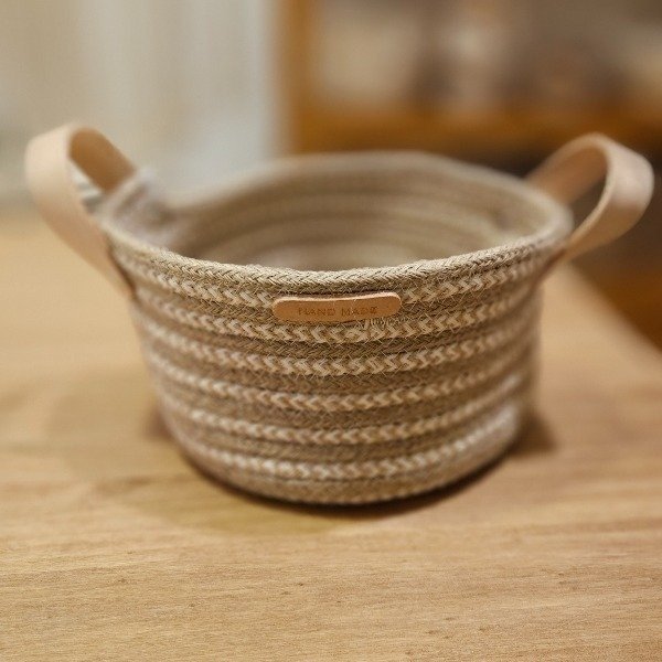 Cesto de soga y yute realizada a mano, con hilo de algodón y manijas de ecocuero.